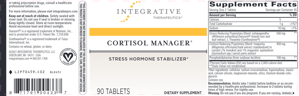 Cortisol Manager has been formulated with stress-reducing ingredients and botanicals to promote relaxation, help alleviate fatigue, and support healthy cortisol levels.* By balancing cortisol levels, Cortisol Manager can help reduce stress, which supports a restful night's sleep without diminishing daytime alertness.*