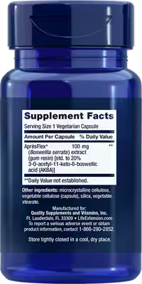 Compounds in Boswellia extract have been shown to bind directly to 5-LOX, an enzyme that transforms fatty acids into inflammatory factors like leukotriene B4. A compound in boswellia called AKBA is the key to this beneficial action. Each 100 mg vegetarian capsule of 5-LOX Inhibitor with AprèsFlex® is standardized to provide 20% of active AKBA from boswellia.