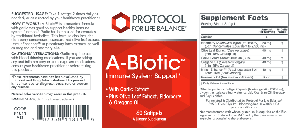 A-Biotic™ is a botanical formula with garlic designed to support healthy immune system function.* Garlic has been used for centuries by traditional herbalists. This formula also includes elderberry concentrate, standardized olive leaf extract, ImmunEnhancer™ (a proprietary larch extract), as well as oregano and rosemary oils. IMMUNENHANCER™ is a Lonza trademark.