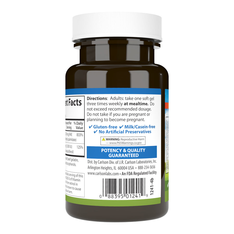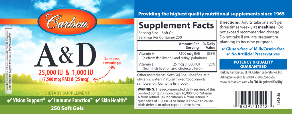 Vitamin A & D provides 25,000 IU (7,500 mcg RAE) of vitamin A from palmitate and fish liver oil and 1,000 IU (25 mcg) of vitamin D3 from cholecalciferol and fish liver oil to support healthy vision and immune system function.