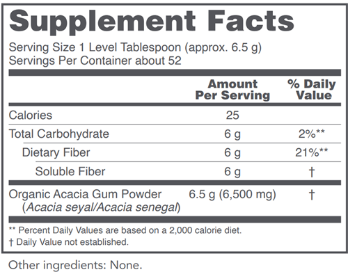 Acacia powder is harvested from the sap of the acacia tree, which is native to parts of Africa, Pakistan, and India. It acts as a prebiotic that supports the vitality of the microorganisms that help maintain a healthy GI environment.* Acacia powder is generally well tolerated and can be used daily. Certified Organic by QAI. This product is sold by weight not volume.