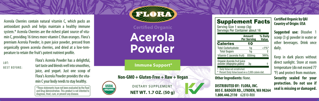 Acerola cherries contain natural vitamin C, which packs an antioxidant punch and helps maintain a healthy immune system.* Acerola cherries are the richest plant source of vitamin C, providing 14 times more vitamin C than oranges. Flora’s premium Acerola Powder is pure juice powder pressed from organically grown acerola cherries and dried at a low temperature to retain the fruits potent nutrient profile. Flora’s Acerola Powder has a delightful, tart taste and blends well into smoothies, juice, and yogurt. Just one scoop of Flora’s Acerola Powder provides the vitamin C your body needs to support overall health and wellness.*