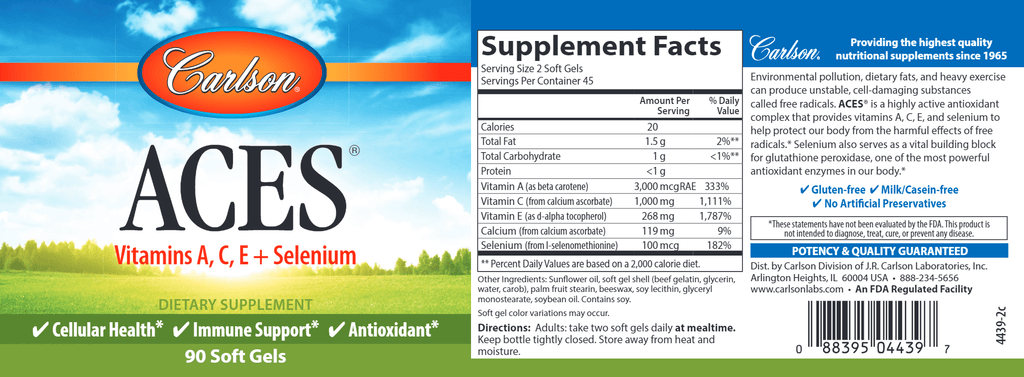 Research has found that selenium and vitamins A, C, and E are more effective when taken together than individually. Combined, they provide a highly active antioxidant complex that helps protect our bodies from free radical damage. Beta-carotene quenches single oxygen molecules; vitamin C guards tissue and blood components; vitamin E protects cell membranes; and selenium serves as a vital building block for glutathione peroxidase, an important member of the antioxidant family. The ACES® formula is recognized as nature's defense, since it mops up free radicals as they form.