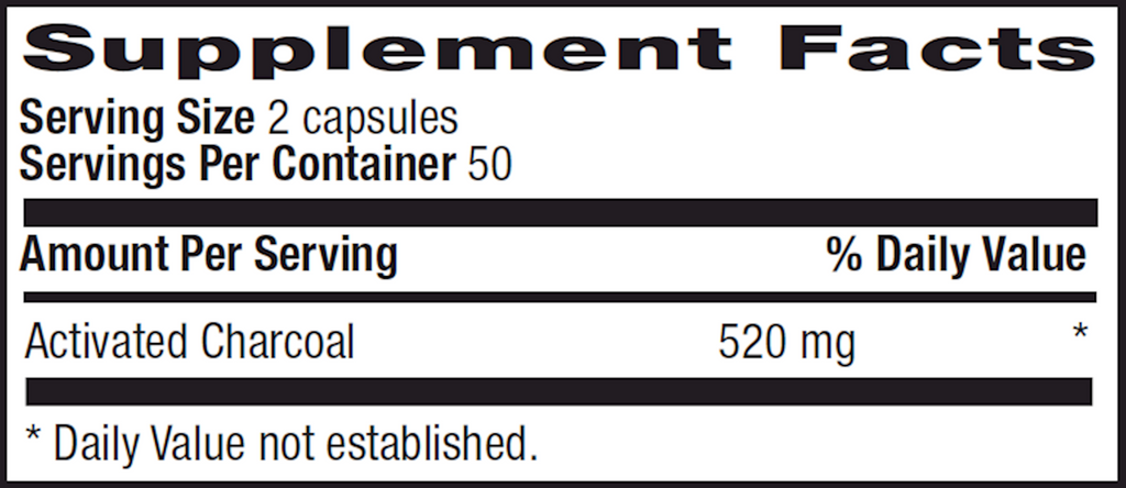 This product has been discontinued. Our recommended substitute is Activated Charcoal - 100 Capsule Bottle.