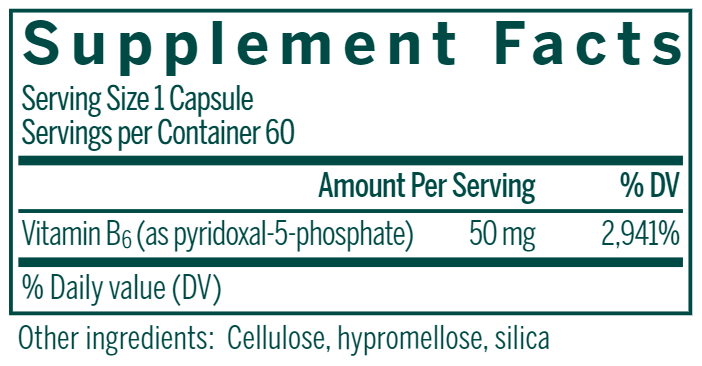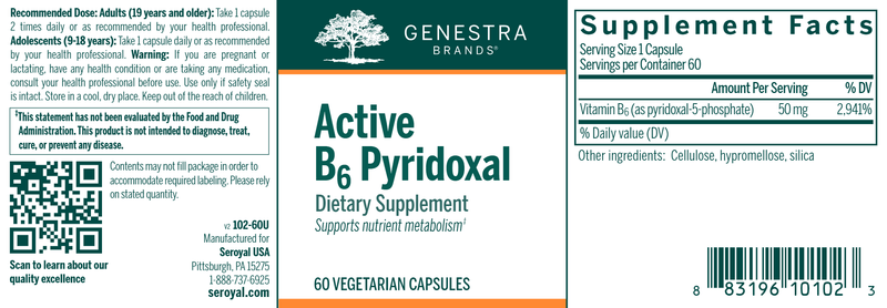 Active B6 Pyridoxal provides vitamin B6 as pyridoxal-5-phosphate (P5P), a biologically active form of the vitamin. P5P is an important cofactor in fatty acid metabolism including the production of important omega-6 polyunsaturated fatty acids, carbohydrate metabolism and the conversion of tryptophan into niacin. Vitamin B6 also supports healthy tissue formation.
