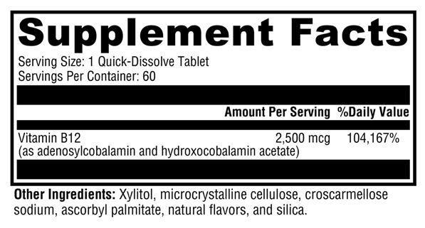 Adeno+Hydroxo B12 combines two forms—adenosylcobalamin and hydroxocobalamin—of the cobalamin family of compounds to yield 2,500 mcg of non-methylated B12. This quick-dissolve, fruit punch-flavored tablet is formulated to support a healthy nervous system and healthy cellular function.*