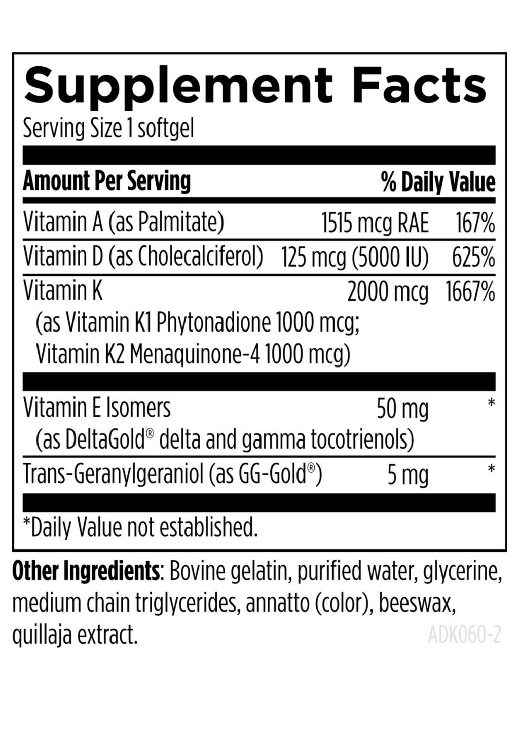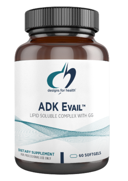ADK Evail™ provides a synergistic combination of fat-soluble vitamins featuring 125 mcg (5,000 IU) of vitamin D, along with efficacious amounts of vitamin A, vitamin K (including K1 and K2), and vitamin E isomers (as DeltaGold® tocotrienols) in one convenient softgel serving. ADK Evail™ is manufactured using the Designs for Health Evail™ technology, a process that utilizes quillaja extract and a patented form of geranylgeraniol (as GG-Gold®) extracted from annatto seeds, to promote maximum nutrient absorption and delivery in the body. This formula is designed to help support the balance of fat-soluble vitamins in the body, and to help promote bone, heart, and immune health.*