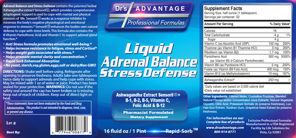Adrenal Balance and Stress Defense contains the patented herbal Ashwagandha extract Sensoril , which provides comprehensive adaptogenic support is used to cope with mental and physical stressors of life. Sensoril works as a response Inhibitor to minimize the body’s negative physiological and emotional response to stressors.* Sensoril enhances the bodies own natural defense to cope with stress levels. This formula also contains the B Vitamin Pantothenic Acid and Vitamin C to support adrenal gland function.*