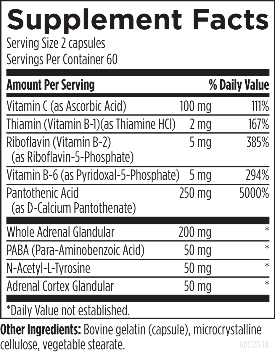 Adrenal Complex is a glandular-based product designed to support overall adrenal function.* Fortified with N-acetyl tyrosine, vitamin C, and a comprehensive spectrum of B vitamins, it is ideal for those under chronic stress due to its ability to help promote normal cortisol balance and catecholamine production (dopamine, norepinephrine, and epinephrine).*