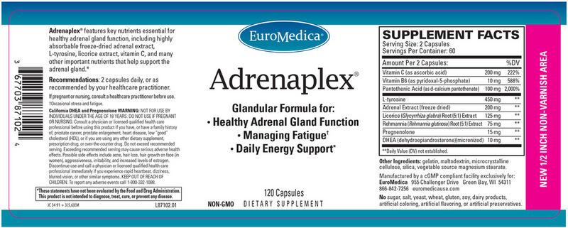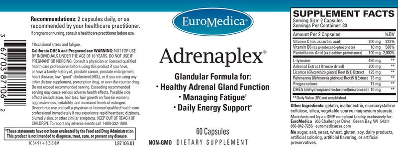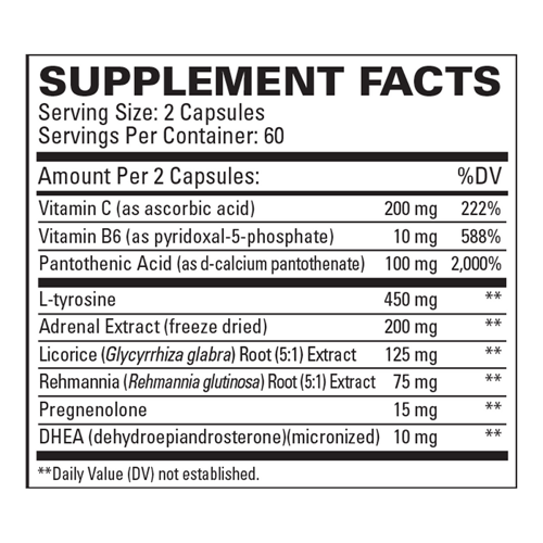 Adrenaplex features key nutrients essential for healthy adrenal gland function, including highly absorbable freeze-dried adrenal extract, L-tyrosine, licorice extract, vitamin C, and other important nutrients. These supportive ingredients for energy and stress resistance make Adrenaplex an excellent daily supplement to support the adrenal glands and the body’s response to stress.