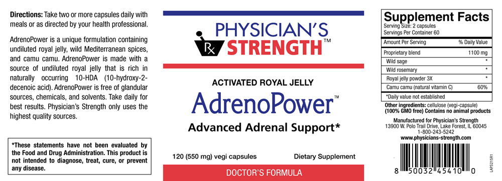 AdrenoPower™ is a unique formulation containing undiluted royal jelly, wild Mediterranean spices, and camu camu. AdrenoPower is made with a source of undiluted royal jelly that is rich in naturally occurring 10-HDA (10-hydroxy-2-decenoic acid). AdrenoPower is free of glandular sources, chemicals and solvents.