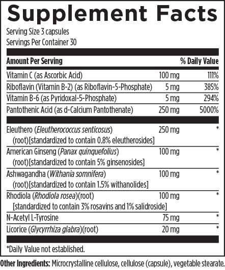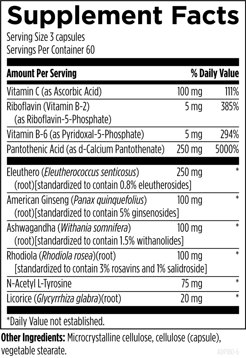 Adrenotone™ is a combination of standardized herbs and nutrients which are known to contribute to rejuvenating the adrenals. This product is designed to help support healthy cortisol levels, hypothalamic and pituitary function (HPTA axis), and catecholamine production (dopamine, norepinephrine, and epinephrine).