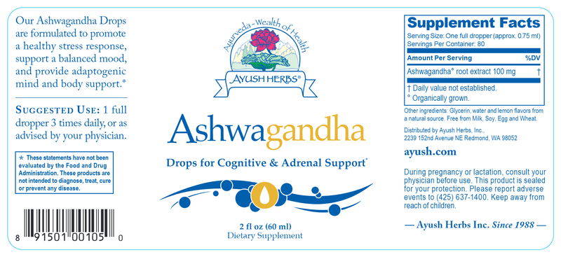 ADULT ASHWAGANDHA DROPS - Ashwagandha translates from Sanskrit as meaning to “impart the strength of a horse.” Withania somnifera promotes energy as well as overall health and longevity. Ashwagandha is most effective during occasional stress, when you need a boost in cognitive and brain function, for immune system enhancement, and to maintain lipid and glucose metabolism already within the normal range.