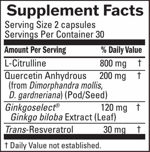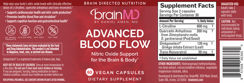 Advanced Blood Flow nitric oxide supplement supports healthy nitric oxide levels in your brain, which helps increase blood flow throughout your body.* Featuring clinically effective doses of L-citrulline, quercetin anhydrous, trans-resveratrol, and ginkgo biloba, not only does this formula improve cognitive function, it also supports cardiovascular, sexual, gut and liver health.