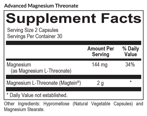 Magnesium L-Threonate (Magtein®) – 2,000 mg and provides 144 mg of elemental magnesium in a highly bioavailable form designed to target the brain support and cognitive function.
