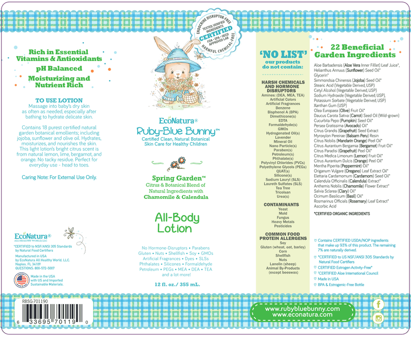 Using 21 of the purest certified natural garden botanical moisturizers of jojoba, sunflower and olive oil, this lotion hydrates, moisturizes and nourishes a skin allowing it to breathe without leaving a tacky residue. This light lotion’s bright citrus scent is from natural lemon, lime, bergamot, and orange. Perfect for everyday use. Certified endocrine-disruptor free and free of harsh chemicals.
