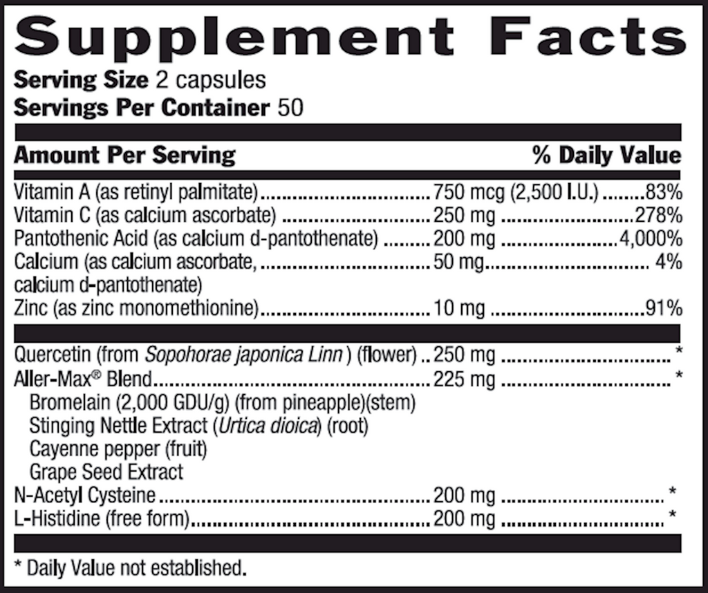 is a unique complex based on the key ingredients of Quercetin, Bromelain, and Vitamin C. Quercetin is a naturally occurring non-citrus bioflavonoid derived from flower buds. Bromelain is an enzyme derived from pineapple stem. Aller-Max® also provides Vitamin C as well, alongside herbs like Stinging Nettle and Cayenne.