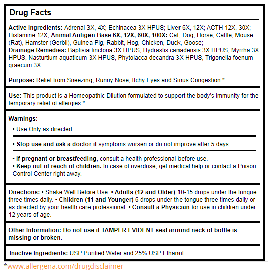 The immune system defends us against disease. When harmful substances are detected, such as animal dander, the immune system creates antibodies. The antibodies destroy or neutralize allergens (i.e. mold, animal dander and/or pollens) that are causing your allergic reactions. Allergena is a Homeopathic Sublingual Immunotherapy that reduces your body's negative reaction to allergens. Allergena homeopathic allergy drops build immunity by giving micro doses of what a person is allergic to so the body becomes safely conditioned to tolerate those allergens and reduce allergic symptoms.