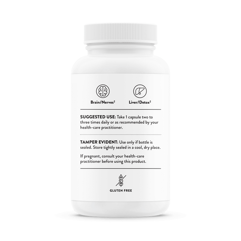 Alpha-lipoic acid (ALA) has historically been used to mitigate toxic insults to the liver.* ALA is also a nutrient cofactor involved in mitochondrial function, thus supporting energy production in the cells. Studies indicate that a higher amount of alpha-lipoic acid – 600-1,800 mg daily – is most effective for neurological support and helping to maintain mental sharpness. Thorne's Alpha-Lipoic Acid provides 300 mg of ALA per capsule. In addition to being an important antioxidant in both fat-soluble and water-soluble tissues, alpha-lipoic acid also helps recycle other antioxidants, including glutathione, another essential antioxidant for liver detoxification.