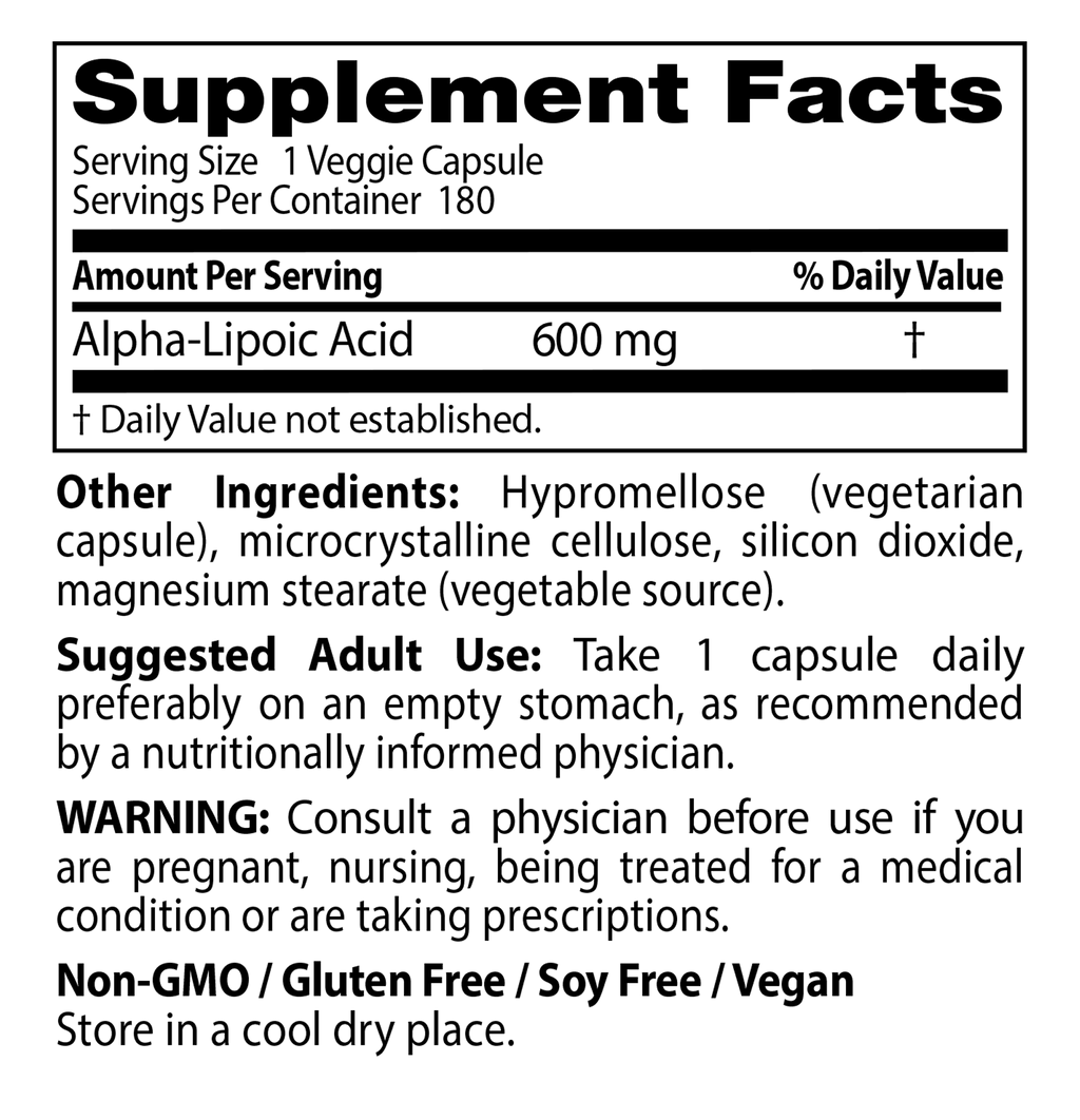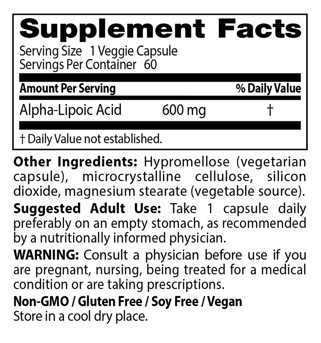 Each veggie capsule delivers 600 mg of ALA. Take one capsule daily, with or without food.