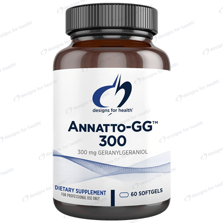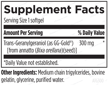 Annatto-GG™ 300 is a unique formula that delivers an impressive 300 mg of trans-geranylgeraniol (GG) per serving. Geranylgeraniol is an important compound that plays critical roles in human physiology and biochemistry. GG is involved in endogenous CoQ10 production, healthy muscle and bone function, steroid hormone regulation, and cellular energy production. This product features GG-Gold®, a patented form of GG extracted from the seeds of the annatto (Bixa orellana) plant. By introducing an external source of GG, Annatto-GG™ 300 may help compensate for the natural decline in GG synthesis during the aging process, in addition to the decreased production of GG associated with certain commonly used medications.*