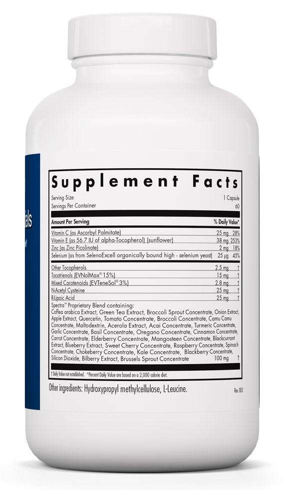 A balanced antioxidant complex featuring SelenoExcell®, a high-selenium compound from yeast, and Spectra™, a blend of coffee, green tea, fruit, vegetable, herb, and spice extracts and concentrates. Mixed carotenoids, vitamin C, vitamin E, zinc, NAC, and R-lipoic acid complete the formula. Contains less than 1 mg of caffeine per capsule.