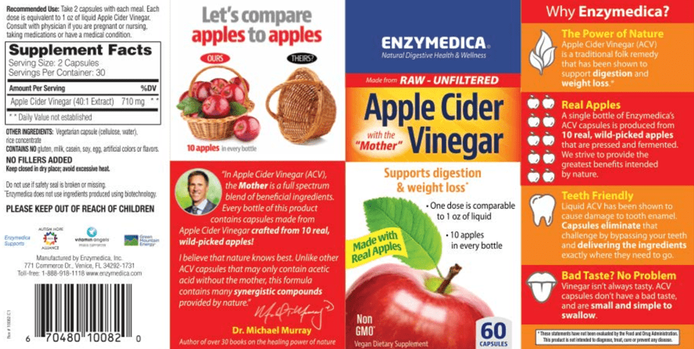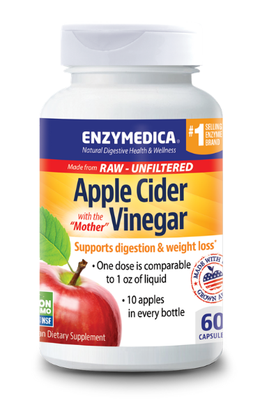 Getting all of the benefits of true, beneficial apple cider vinegar—ranging from supporting healthy weight loss to digestion, healthy blood sugar and much more*—without the harsh taste or potential harm to teeth enamel that taking the liquid form presents. Enzymedica’s Apple Cider Vinegar is made from real apples, with the Mother included and squeezed into easy-to-take capsules. One dose is equal to one fluid ounce of high-quality, raw apple cider vinegar.