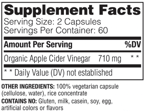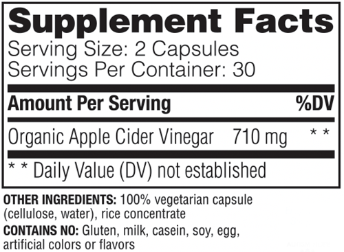 Take 2 capsules with each meal. Each dose is equivalent to 1 oz of liquid Apple Cider Vinegar. Consult with physician if you are pregnant or nursing, taking medications or have a medical condition