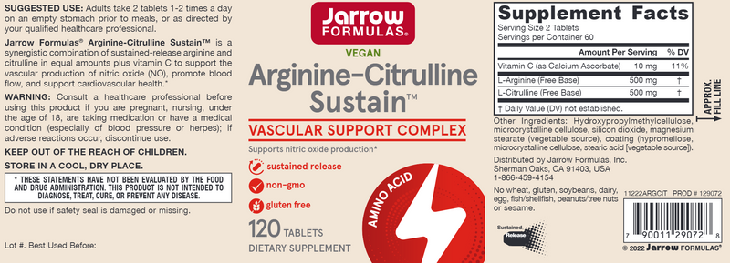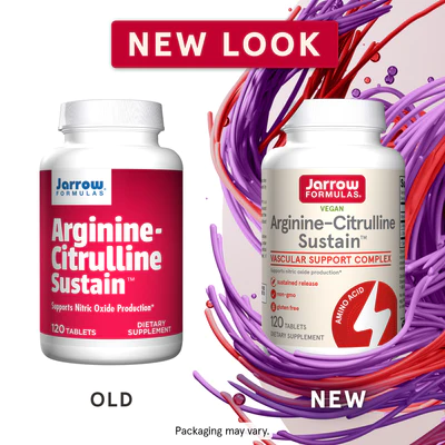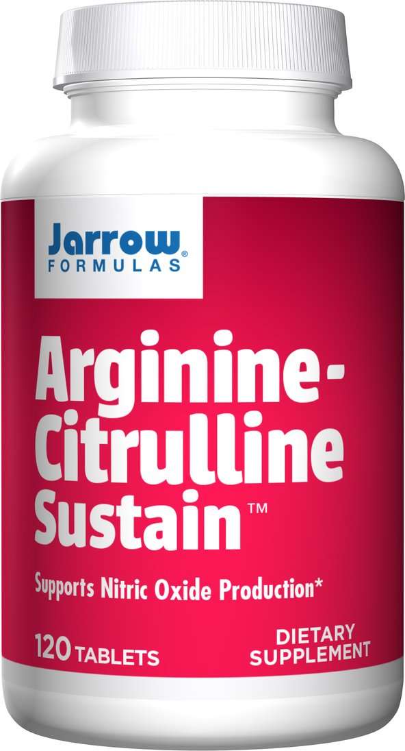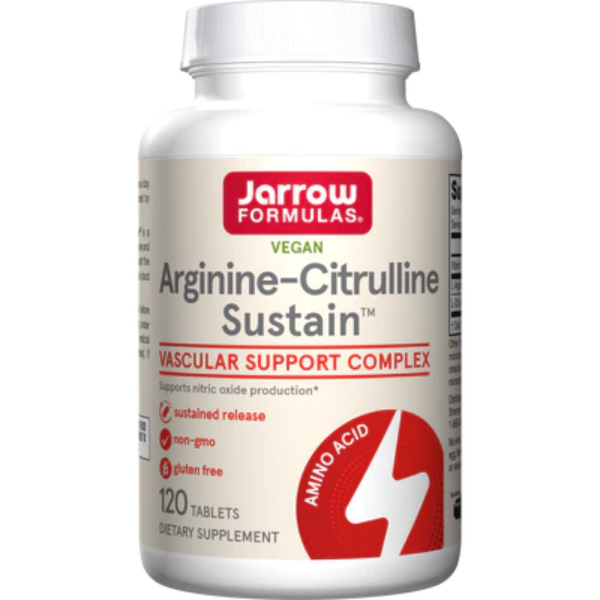 Jarrow Formulas® Arginine-Citrulline Sustain™ is a synergistic combination of sustained-release arginine and citrulline in equal amounts plus vitamin C to support the vascular production of nitric oxide (NO) and promote blood flow and cardiovascular health.