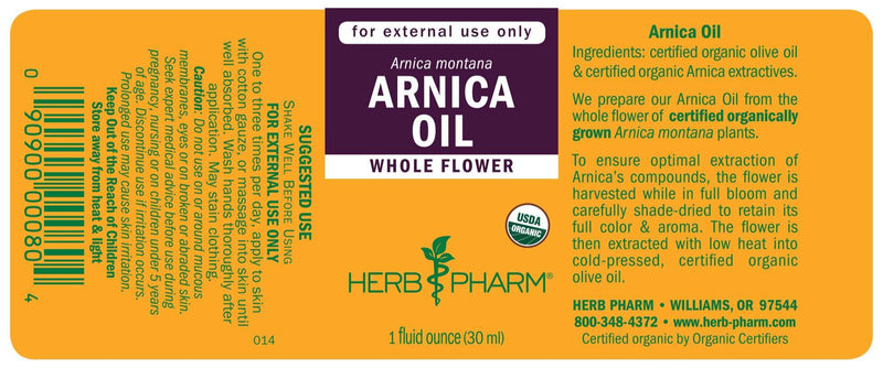 Herb Pharm prepares Arnica Oil from the whole flower of certified organically grown Arnica montana plants. The flowers are milled at the last moment before extraction in cold-pressed olive oil.