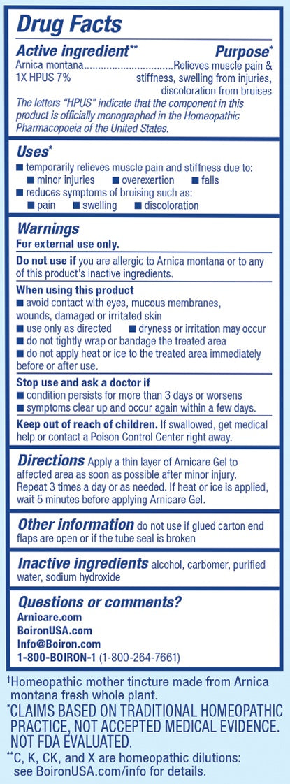 A homeopathic medicine, Arnicare Gel does not contain menthol, camphor, methyl salicylate, capsaicin, fragrances, dyes, or parabens. It does not mask symptoms that may indicate a more serious condition. Arnicare Gel is available over the counter in 1.5 oz and 2.6 oz tubes and a 4.2 oz value-size tubes.