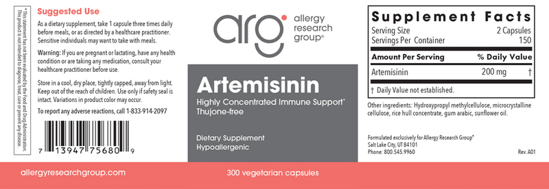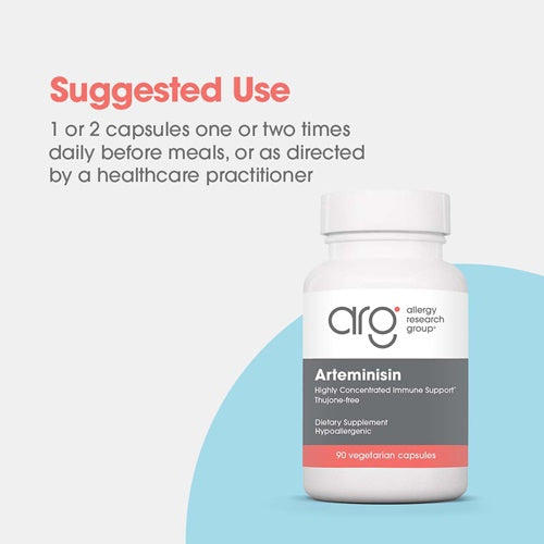Suggested Use: As a dietary supplement, 1 or 2 capsules one or two times daily before meals, or as directed by a healthcare practitioner. Artemisinin is best taken as part of a program that includes appropriate liver support nutrients. Sensitive individuals may want to take with food.
