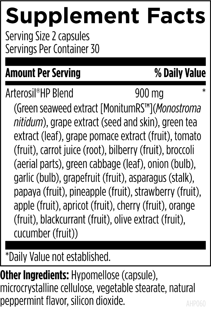 Arterosil® HP is a proprietary blend of a rare seaweed and fruit and vegetable extracts to help support arterial and endothelial health.* The main bioactive component in Arterosil® HP is clinically researched rhamnan sulfate (as MonitumRS™), a polysaccharide (type of carbohydrate) extracted from a unique green seaweed, Monostroma nitidum, clinically shown to help support the integrity and function of the endothelial glycocalyx.* Arterosil® HP provides a novel approach in supporting the regeneration of the arterial wall lining.*