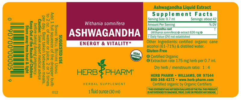 Herb Pharm prepares Ashwagandha extract from the root of Certified Organic Withania somnifera plants. The root is harvested at the peak of readiness, and carefully shade-dried to retain its full color and aroma. Then it is thoroughly extracted. The herb is revered in Ayurvedic traditions.