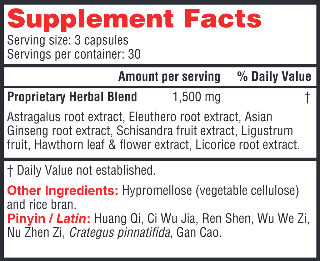 A warming tonic formula that eases fatigue and supports immunity and lung health. Adaptogenic herbs, such as astragalus, eleuthero, and schisandra, help balance the body in times of mental and physical stress.