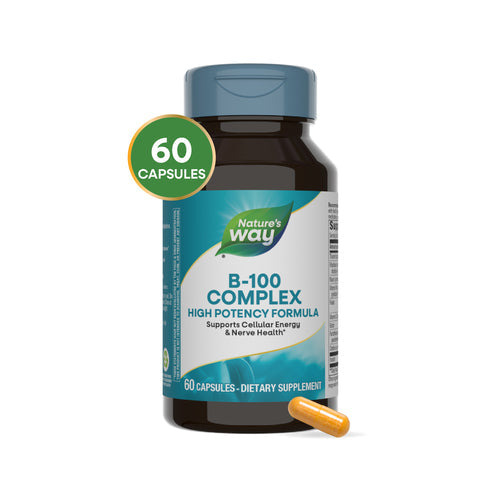 B-vitamins are essential to your daily wellness, as they help convert the food you eat into the energy you need for every step of your journey.* Nature’s Way B-100 Complex helps support cellular energy and nerve health, manufacture hormones and proteins, and maintain nerve structures.*