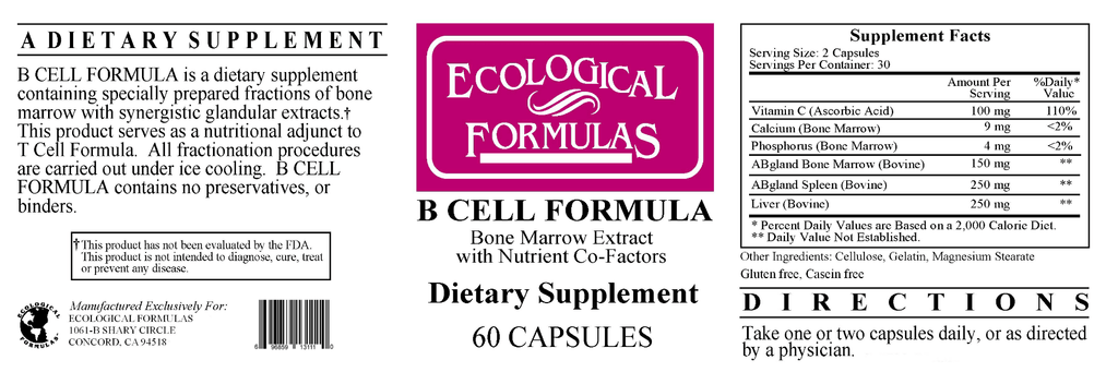 A dietary supplement designed to support and strengthen the body's natural immune system response. The key ingredient in B Cell by Ecological Formulas is specially prepared fractions of bone marrow with synergistic glandular extracts. Bone marrow has been shown effective not only at supporting the immune system but also helps to support the intestinal tract, promote healthier skin, hair and nails, support the health of the skeletal system, and support a healthy inflammation response.