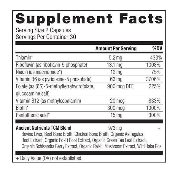Weaving the ancient principles of ancient TCM (Traditional Chinese Method) with body-ready B vitamins and superfood ingredients, Ancient Nutrients Vitamin B Complex features a potent combination of cognitive and energy-supporting real-food ingredients with fermented and co-enzymated B vitamins.