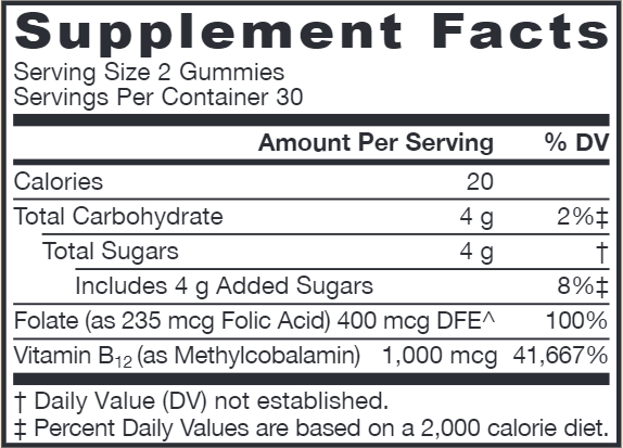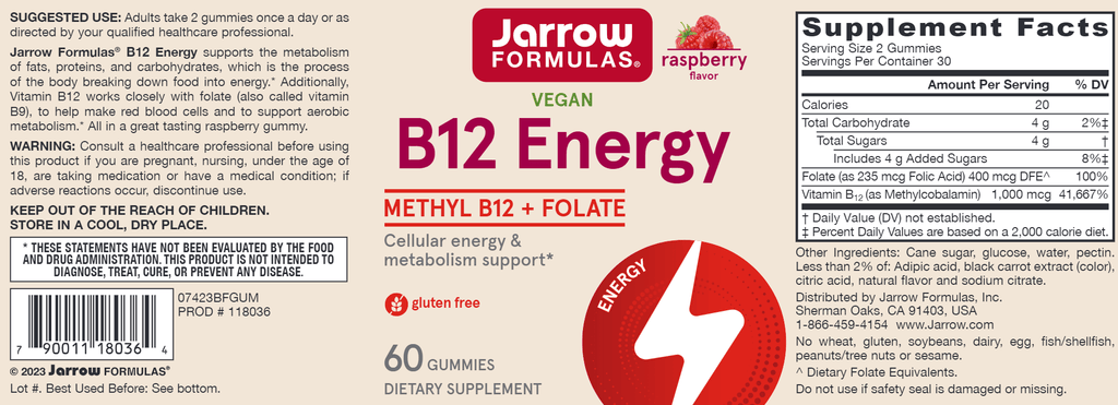 Jarrow Formulas® B12 Energy supports the metabolism of fats, proteins, and carbohydrates, which is the process of the body breaking down food into energy.* Additionally, Vitamin B12 works closely with folate (also called vitamin B9), to help make red blood cells and to support aerobic metabolism.* All in a great tasting raspberry gummy.