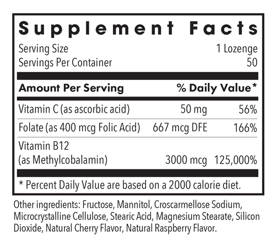 Suggested use: As a dietary supplement, adults place 1 lozenge daily under the tongue 30 seconds before swallowing, or as directed by a healthcare professional. May be taken with or without food.