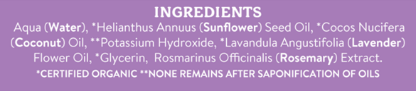 Ingredients: Water, Saponified Organic Sunflower Oil, Saponified Organic Coconut Oil, Organic Glycerin, Rosemary Extract, Organic Lavender Oil