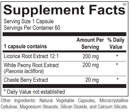 Licorice and Peony: Widely used together in clinical trials to help maintain normal DHEA, prolactin and prostaglandin levels, licorice and peony help support healthy progesterone secretion and estrogen balance. Studies have shown this combination of botanicals supports normal DHEA-S levels, decrease prostaglandin production and normalize prolactin levels.