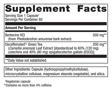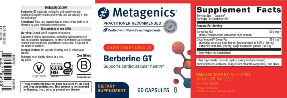 Berberine GT is a dual-action formula that supports heart health, weight management, and healthy glucose metabolism. It contains 500 mg of Berberine HCl, the most researched form of Berberine, with 200 mg of decaffeinated green tea.