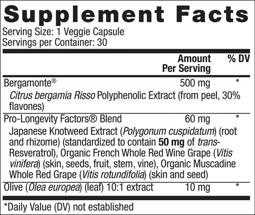 Pro-Longevity Factors® Blend: Our proprietary blend with organic red grapes from the heart of France and Resveratrol from wildcrafted Japanese Knotweed promotes healthy cellular productivity.*