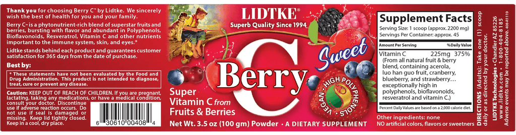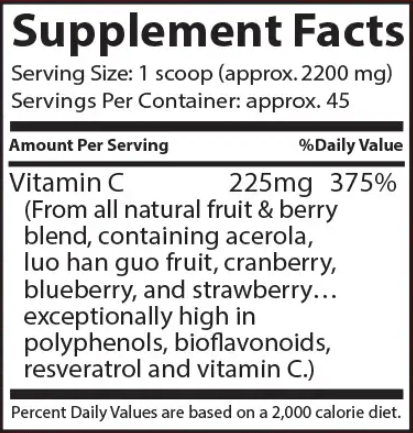 Berry C is natural blend of dried fresh fruits and berries, which contain the complete natural form of Vitamin C, and is rich in Polyphenols, Bioflavonoids, Resveratrol, Ellagic Acid, and other extremely beneficial nutrients.