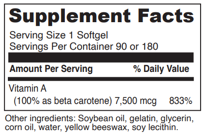 Beta carotene is converted into Vitamin A by the liver on an “as needed” basis and is water soluble (unlike Vitamin A, which is fat soluble) which means it does not build up in the body. Beta carotene also supports Vitamin A deficiency without any problem of toxicity associated with “mega” doses of Vitamin A.*