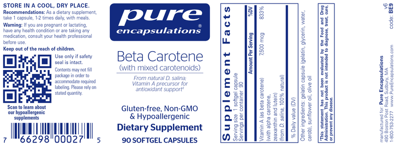 Beta carotene is a dietary antioxidant and vitamin precursor that supports the body's immune system and promotes visual acuity and vascular health. The body naturally converts beta carotene to vitamin A as needed to offer optimal nutritional support.