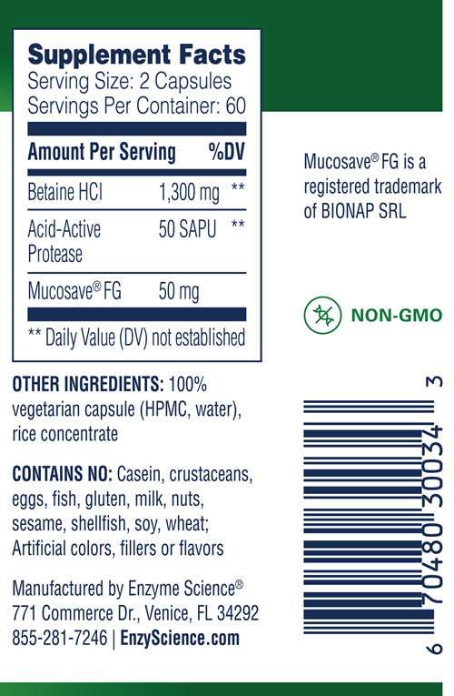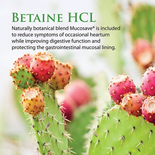 Betaine HCl also features Mucosave® FG to support and maintain a healthy mucosal system in the stomach.* Mucosave® FG is a patented and clinically studied blend of prickly pear and olive leaf extracts that have been shown to have protective effects by creating a barrier in the lining of the stomach.*