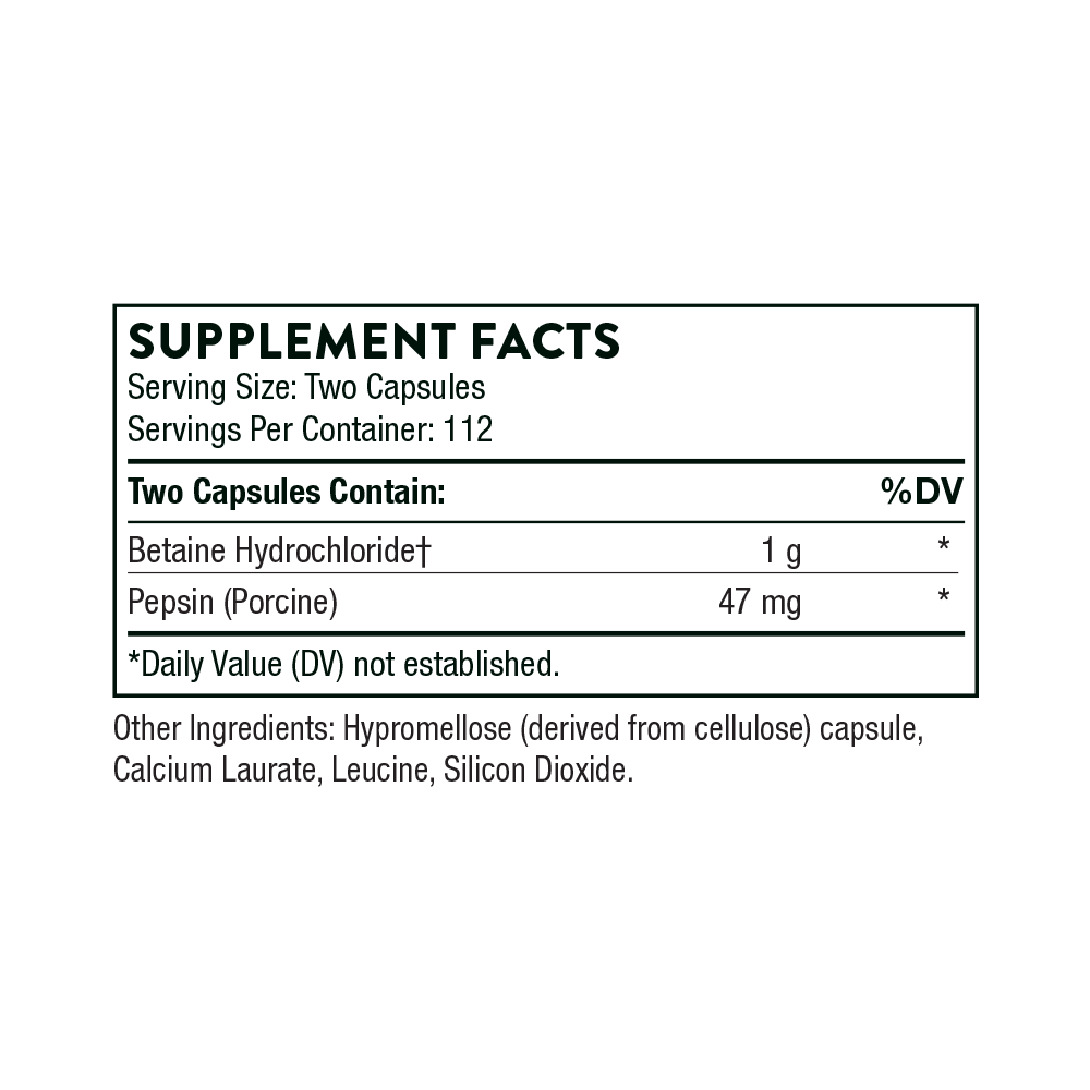 Indigestion can be caused by many things – including inadequate amounts of hydrochloric acid (HCl) in the stomach. HCl secretion in the stomach does several positive things. It assists protein digestion by activating pepsinogen to pepsin, it renders the stomach sterile against ingested pathogens, it inhibits undesirable overgrowth in the small intestine, and it encourages the flow of bile and pancreatic enzymes. Hydrochloric acid also facilitates the absorption of a number of nutrients, including folate, vitamin B12, ascorbic acid, beta-carotene, iron, and some forms of calcium, magnesium, and zinc. Numerous studies have shown that hydrochloric acid secretion in the stomach begins to decline with advancing age. Overuse of antacids or acid blockers can also lead to low levels of hydrochloric acid in the stomach, which can result in poor protein digestion. Thorne's Betaine HCl & Pepsin comes from a porcine source.