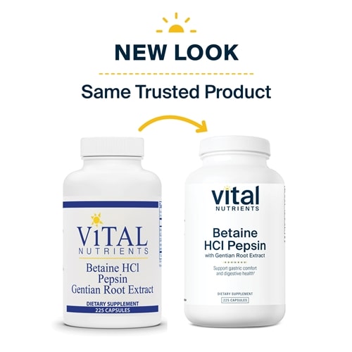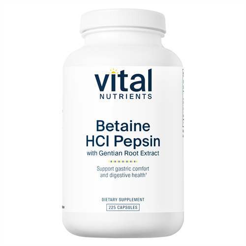 Betaine HCl Pepsin & Gentian Root is a carefully formulated blend designed to support healthy digestion when taken at the beginning of a meal.* Gentian, a bitter herbal, works with Betaine HCl to help maintain a healthy pH in the stomach and small intestine, promoting normal protein digestion, as well as enhancing the absorption of minerals and Vitamin B12.* Pepsin, a key digestive enzyme, assists in breaking down proteins into polypeptides. This supplement features pure, uncut Pepsin, which is free of lactose to avoid aggravating digestive issues in lactose-sensitive individuals.* Betaine HCl Pepsin & Gentian Root Extract is often used alongside Pancreatic Enzymes for optimal digestive support.*